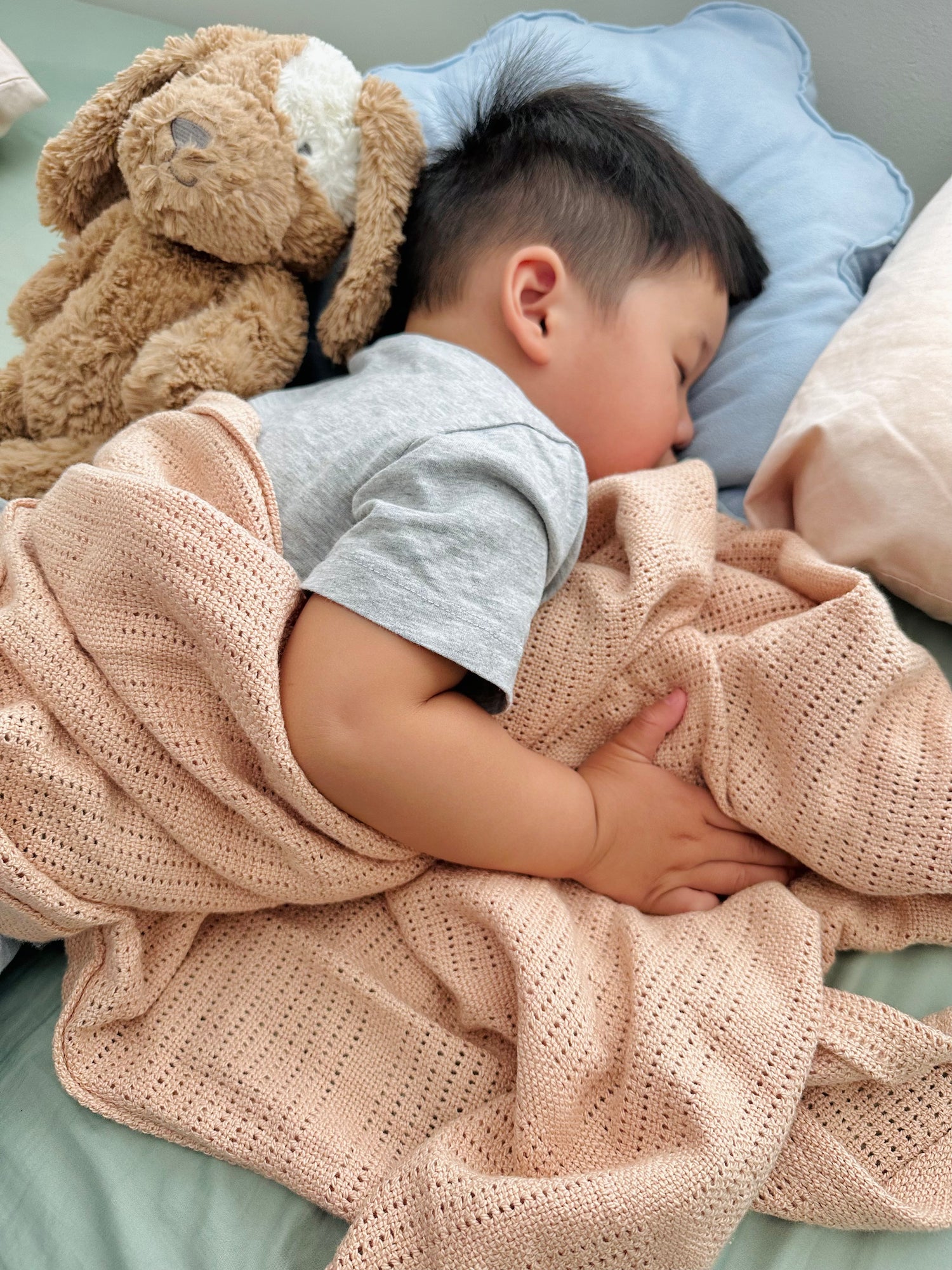 一開始只是擔心他不能呼吸所以讓他蓋洞洞毯,沒想到Eggy對這個洞洞毯就這樣產生感情了,不管去到哪裡都要帶著洞洞毯,每次他難過生氣或是爆哭,只要讓他抱著洞洞毯,他就會立刻冷靜下來。睡覺的時候也是,我們完全不需要哄睡,他只要有他的洞洞毯就能自主入睡了,對他來說洞洞毯給他很大的安全感,抱著它他就會覺得很安心。